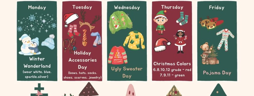 Christmas Spirit Week Dec. 15-19! We hope to see everyone participate!!