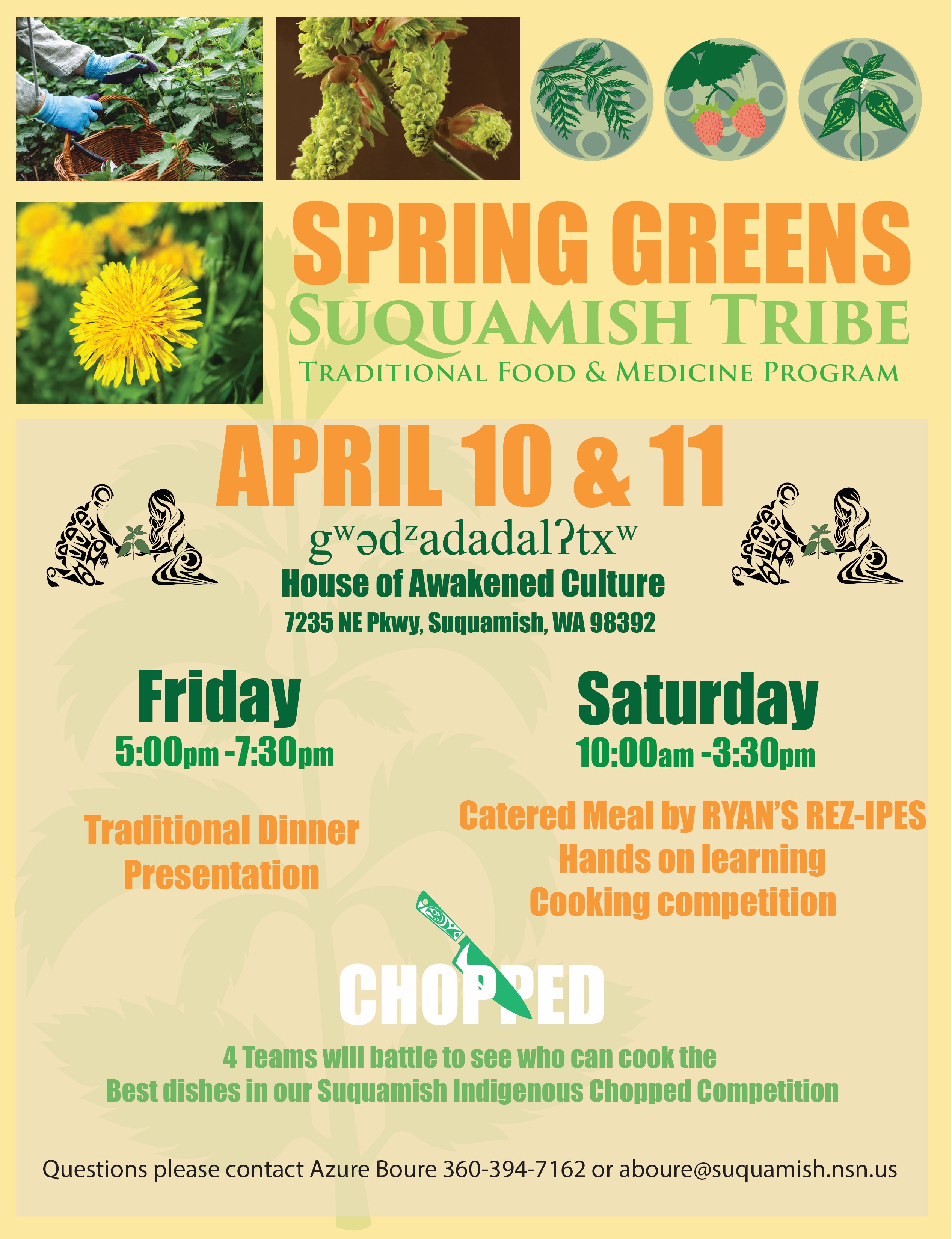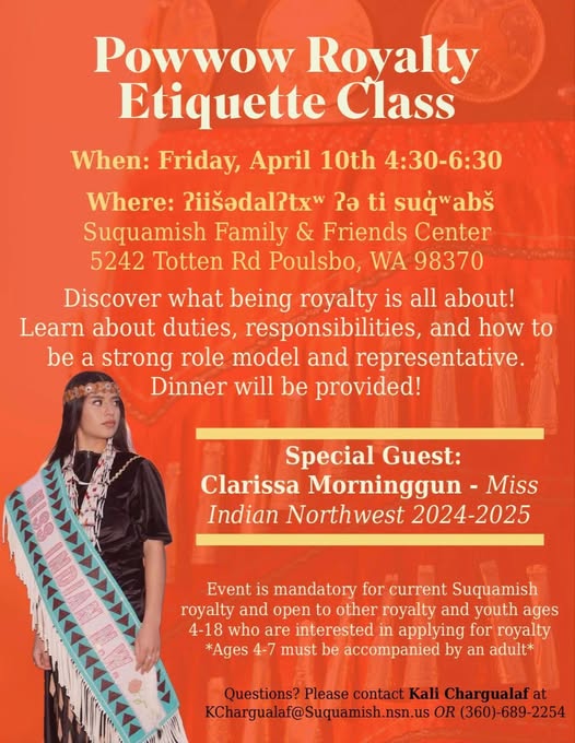 Suquamish Clearwater Casino & Resort in the Canoe Event Center Sat . April 25 - Grand Entry @ 1pm & 7pm Sun. April 26 - Grand Entry 1pm